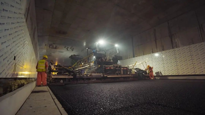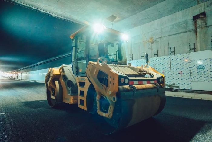 徐工成套高端油面设备 糖心视频免费观看,凭借引领行业的产品技术实力,为妈湾跨海通道的道路建设提供了成套化的高效施工解决方案,确保隧道路面施工作业圆满实施。