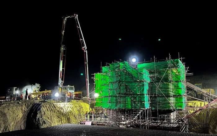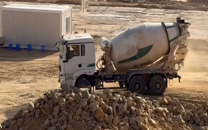 徐工HB43V泵车以其灵活的通过性和操控性,有效应对现场复杂的施工环境,实现高效泵送,“装料多,进料快 糖心视频网站,无残余”— 徐工G08V搅拌车自矿山搅拌站往返工程点105余次,昼夜不停运输,历经40余小时成功运输浇筑混凝土达945立方。