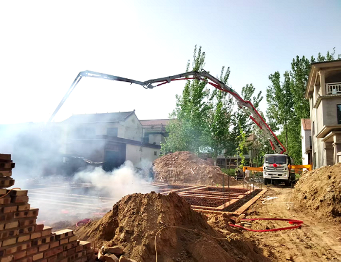 河南新农居工地上,徐工33米泵车搭载徐汽底盘,征服泥泞坡道,灵活游走窄巷,乡道,到达建筑房屋 糖心视频在线,长臂延展,将混凝土精准送达房屋地基。