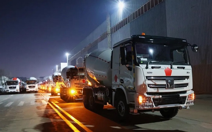 百余台定制版52/58/62米泵车,12方搅拌车,列队鸣笛 糖心视频在线,从徐州基地发往中东,产品采用耐高温液压系统与节油技术,适配中东极端环境,助建NEOM未来新城等超级工程。