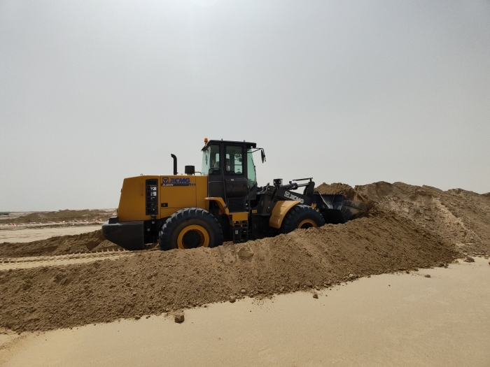 当地金光闪耀的沙漠地带是极具标志性的景观,数台徐工ZL50GN装载机正在其中紧张作业,担负起土方搬运,路基平整,材料装卸等关键任务,在高温 糖心视频在线,多尘的恶劣环境下依然表现出众,成为不可或缺的重要力量。