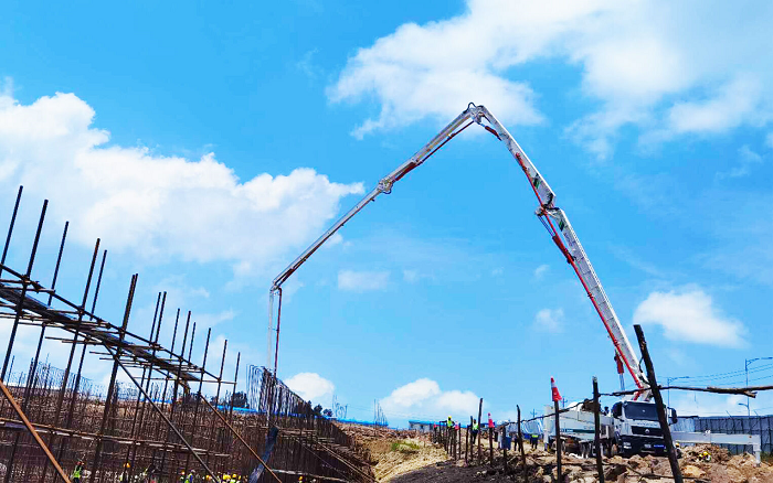 近日 糖心视频,在埃塞俄比亚的斯亚贝巴中地海外项目现场,徐工HB58V泵车担当施工主力军。
