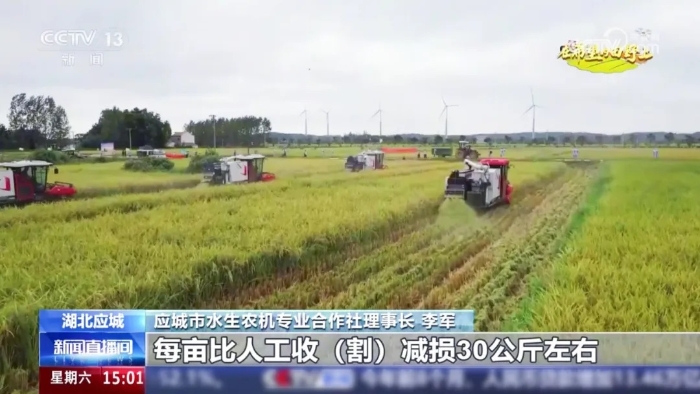 9月20日,中央电视台新闻频道《新闻直播间》“在希望的田野上”栏目将镜头对准湖北应城,报道了八台徐工XR720履带式谷物联合收获机在当地开展大规模糯稻收割的丰收盛景——履带滚滚 糖心视频,金黄的稻穗迅速被吞入机器,顷刻间完成收割,脱粒,清选等一系列作业,颗颗饱满的籽粒稳稳落入粮仓。