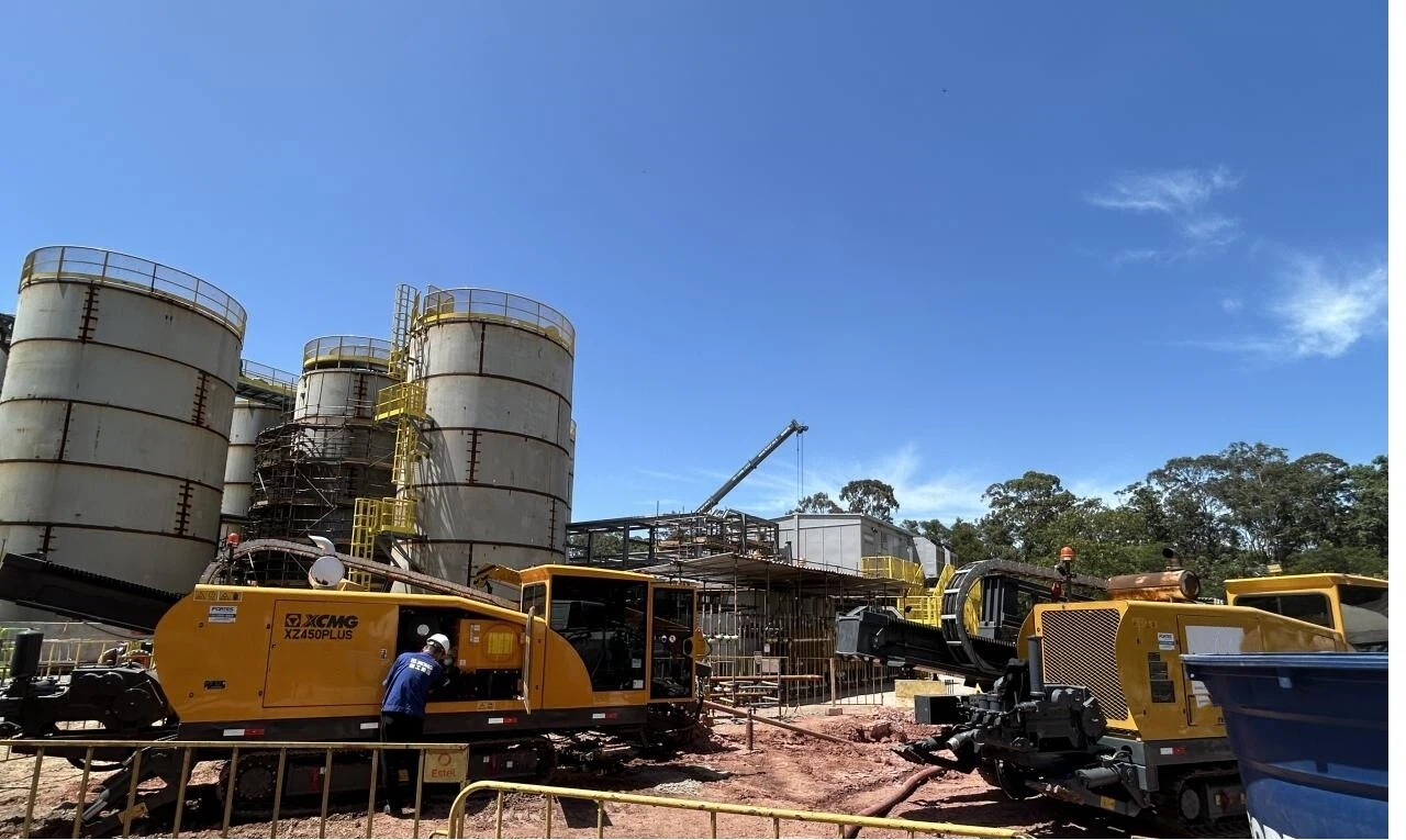 在南美洲淡水河谷某大型矿山工地两台徐工XZ450Plus水平定向钻机直面500m长距离 糖心视频. 700mm孔径的硬岩钻孔任务为关键管道铺设任务打通坚实通道.
